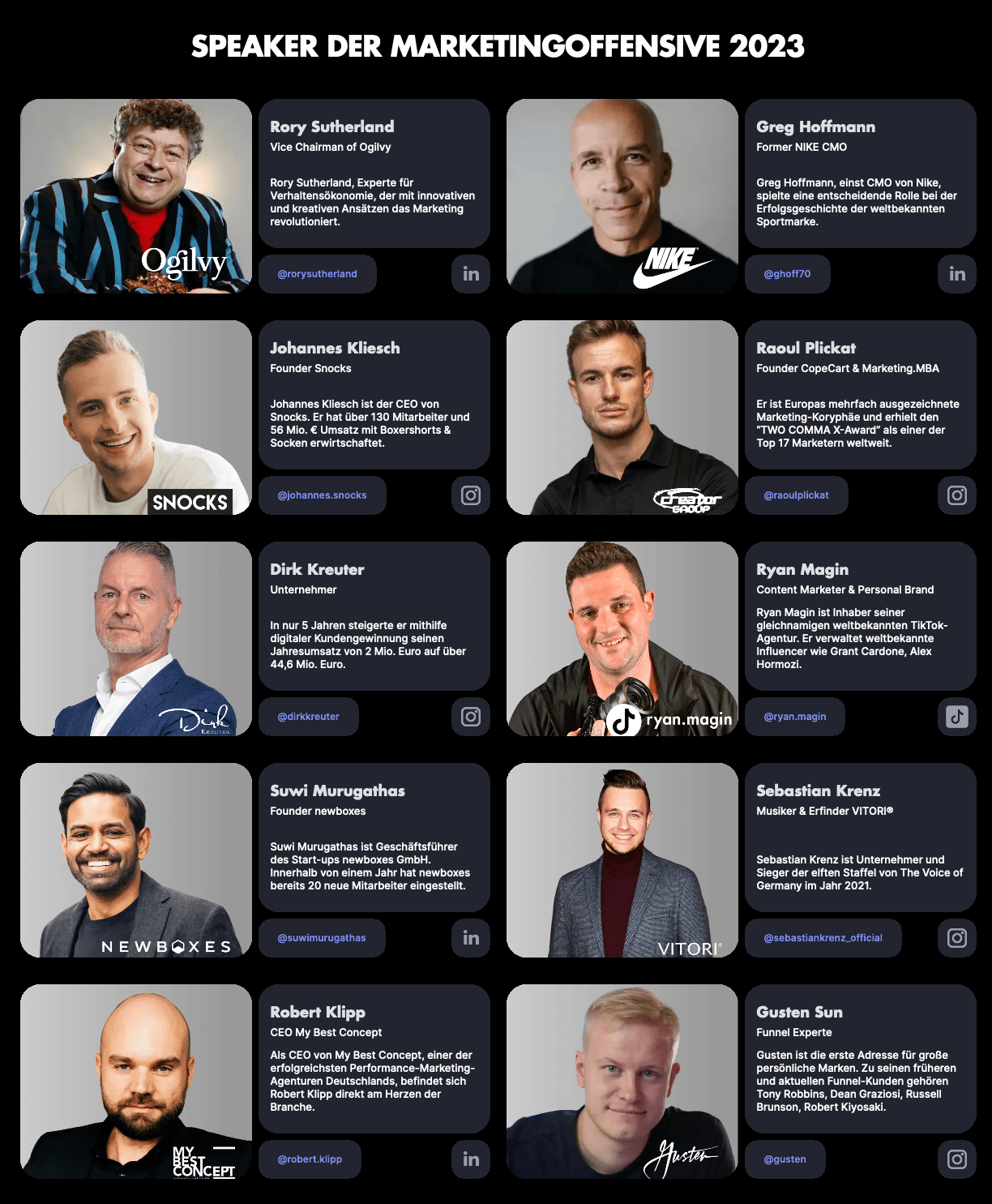 Die Marketingoffensive 2023 von Dirk Kreuter findet dieses Jahr in Hamburg statt. Halte dir deinen Terminkalender für den 09. und 10. September frei! Auf dieser Veranstaltung treffen sich 3000 Teilnehmer und es gibt eine begleitende Messe. Über zwei Tage hinweg hast du die Möglichkeit, dich mit Gleichgesinnten und Experten der Branche auszutauschen und dadurch neue Partnerschaften und Aufträge zu generieren.